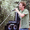 הזמר מוקי בהופעתו ביום הסטודנט באוניברסיטת תל אביב. כמה עשרות מפגינים