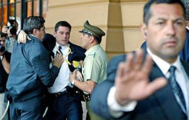 שומרי ראשו האישיים של הנשיא בוש, המלווים אותו באופן צמוד, מיהרו בעקבותיו אולם אנשי ביטחון צ'יליאנים חסמו את דרכם ומנעו מהם להיכנס לאולם. מאחר שמדובר בפריצה חמורה בטבעת האבטחה, החלו שומרי ראשו של הנשיא להתקוטט עם אנשי הביטחון הצ'יליאנים ובמקום פרצה מהומה.