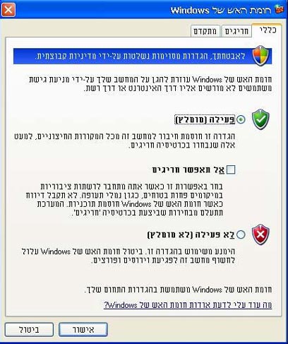 פעילה (אל תאפשר חריגים). כאשר תבחרו בתיבת הסימון "אל תאפשר חריגים", חומת האש תחסום את כל הבקשות שלא הוזמנו מראש להתחברות למחשב שלכם, כולל בקשות הנשלחות אל תוכניות או שירותים שנבחרו בכרטיסיה חריגים. השתמשו בהגדרה זו כאשר דרושה לכם הגנה מרבית על המחשב, לדוגמה, כאשר אתם מתחברים לרשת ציבורית במלון או בשדה תעופה, או כאשר וירוס או תולעת מסוכנים מתפשטים באינטרנט.