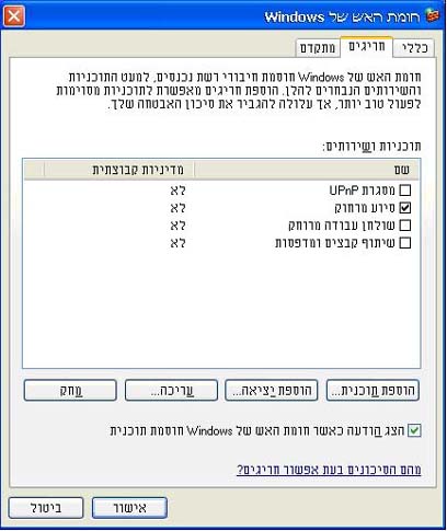 ניתן לאפשר הפעלת תוכנית הדורשת תקשורת גם על ידי הגדרה פשוט להגן על המחשב שלכם. ידנית באמצעות פקד ה"הוספת תוכנית", כמו כן, ניתן לפתוח יציאה (Port) הדרושה לכם באמצעות פקד ה"הוספת יציאה".