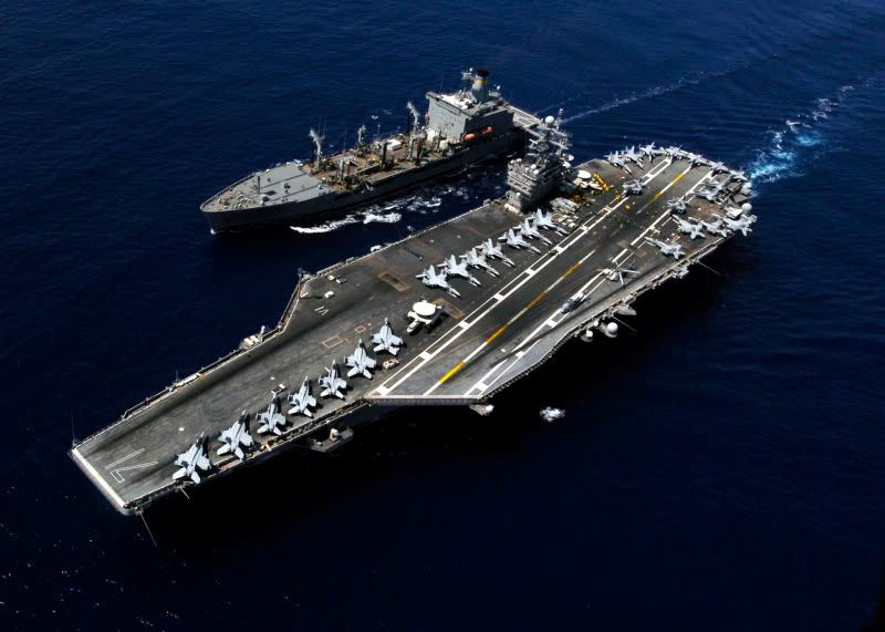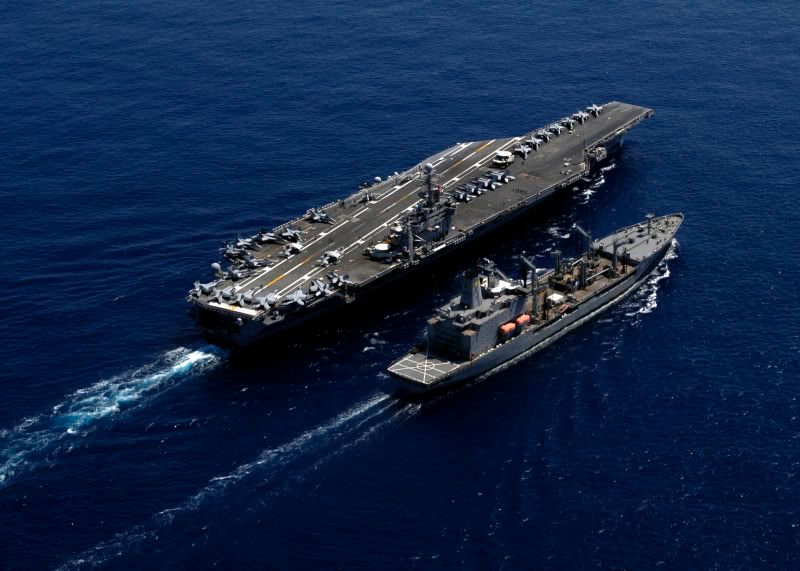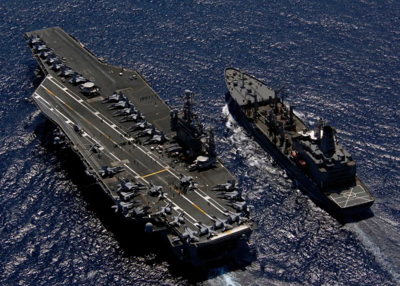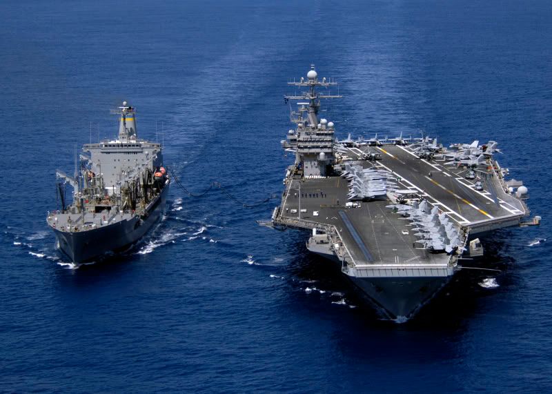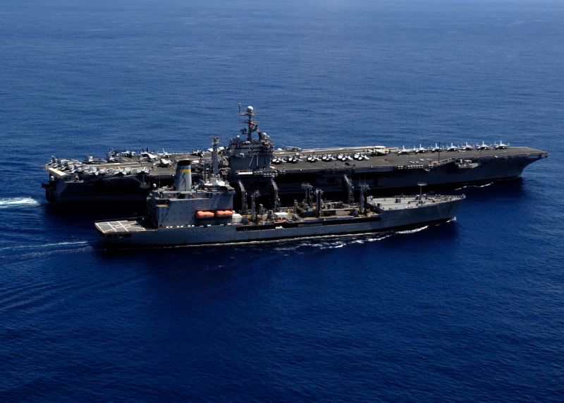 ATLANTIC OCEAN (April 27, 2008) The Nimitz-class aircraft carrier USS Theodore Roosevelt (CVN 71) steams alongside the Military Sealift Command fleet replenishment oiler USNS John Lenthall (T-AO 189) during a fueling-at-sea. U.S. Navy photo by Mass Communication Specialist 2nd Class Nathan Laird (Released)