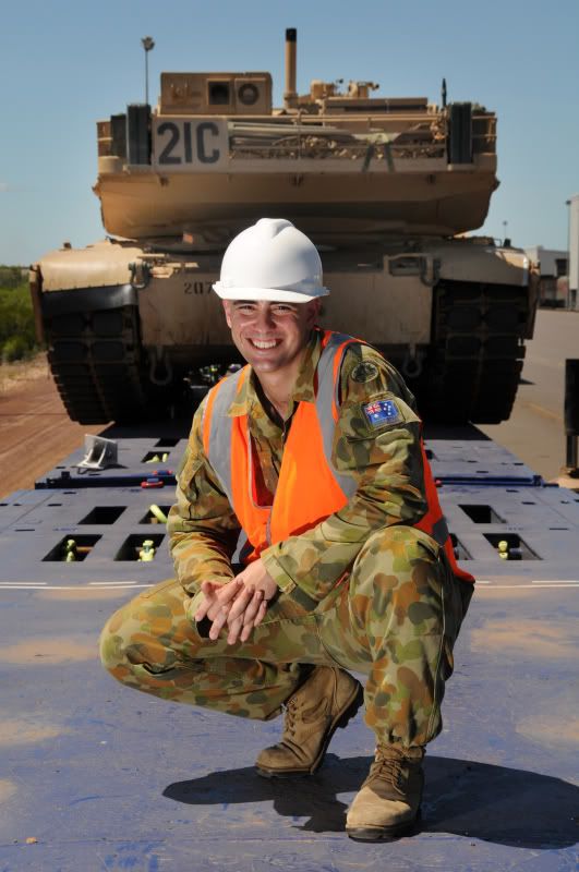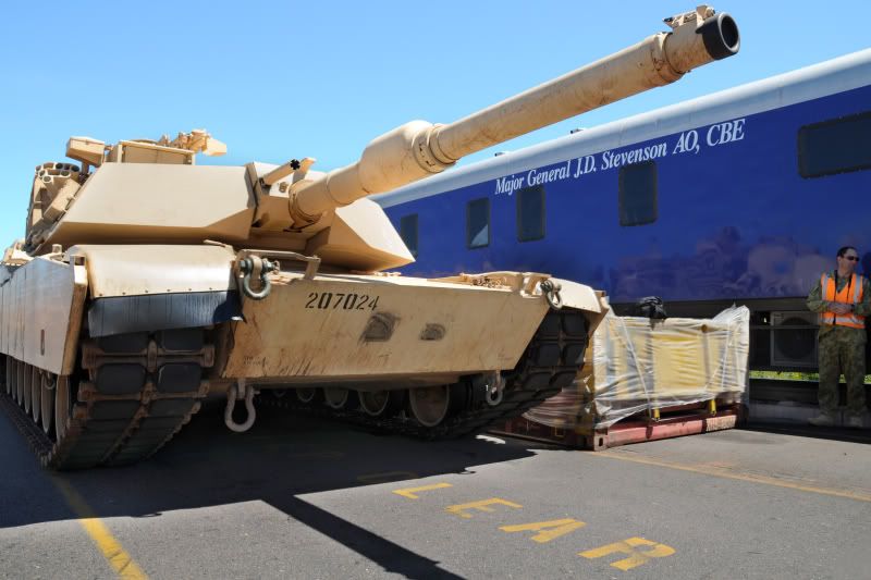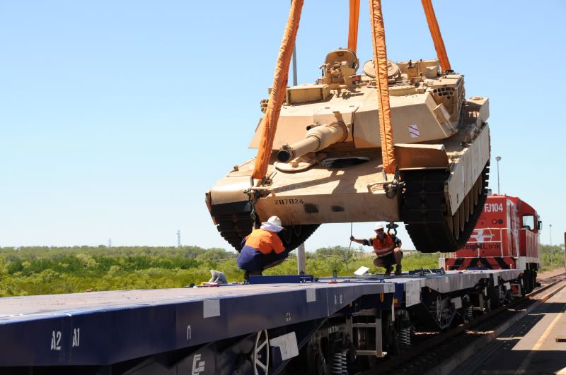 An M1A1 Abrams Tank from 1st Armoured Regiment waits by the new accommodation cart for loading onto purpose-built rolling stock at Berrimah Rail Yard in the Northern Territory.