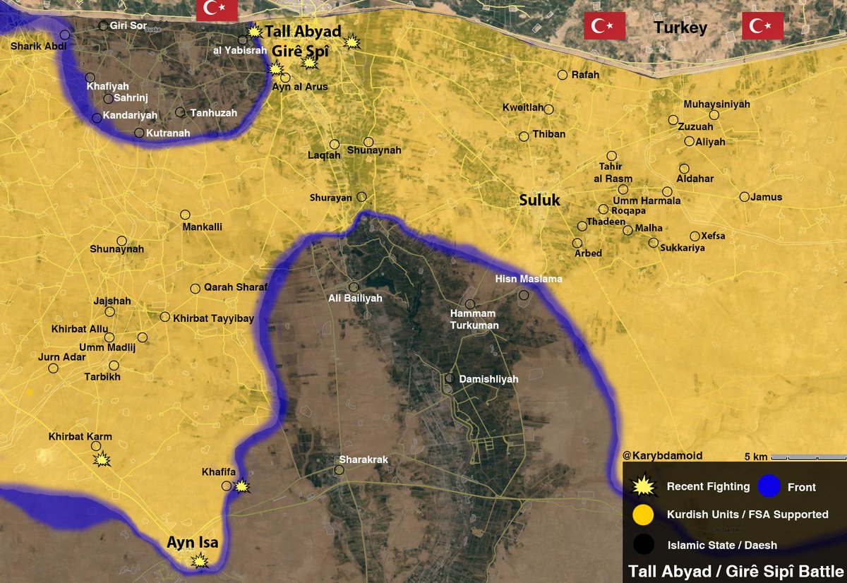 Many rebel battalions send military reinforcements throughout the day from the western countryside of Aleppo and Idlib to Aleppo's northern countryside. These reinforcements are distributed along the front line with IS, from the Turkish border to the outskirts of the industrial city of Sheikh Najjar in Aleppo governorate. Although these reinforcements managed to stop IS' progress, they have thus far failed to restore IS-controlled towns; IS is still on the offensive despite all of the incurred losses. Most of the violent clashes between the rebels and IS took place on June 5 in the village of al-Sheikh Rih near the Turkish border.